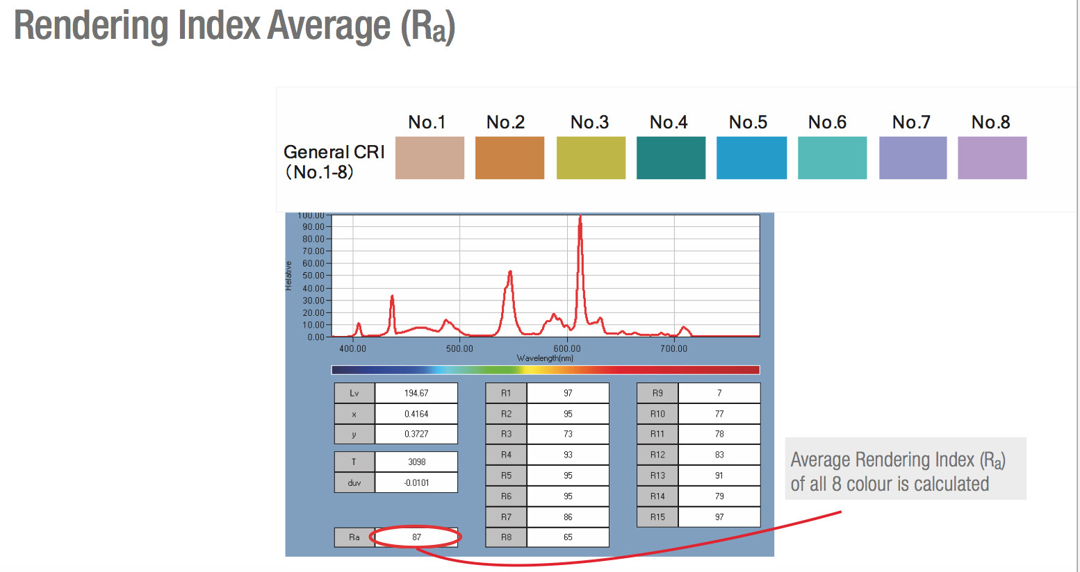The result of the illumination of these eight colors is then compared with that of the standard illuminant or daylight and the CRI value of the analysed light source is the average of the 8 individual scores. An example calculation from a dedicated CRI software below:
