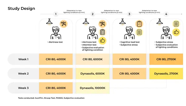 The Fraunhofer IBP designed a series of comparative tests to evaluate the effects of Dynasolis™ lighting on human alertness, attention, and relaxation. Approximately 35 test subjects participated in each test series, where they were exposed to different lighting conditions, including standard LEDs (2700K, 4000K, and 6000K, each with CRI 83+) and the Dynasolis™ solution at color temperatures of 2700K, 6000K, and 10000K.
