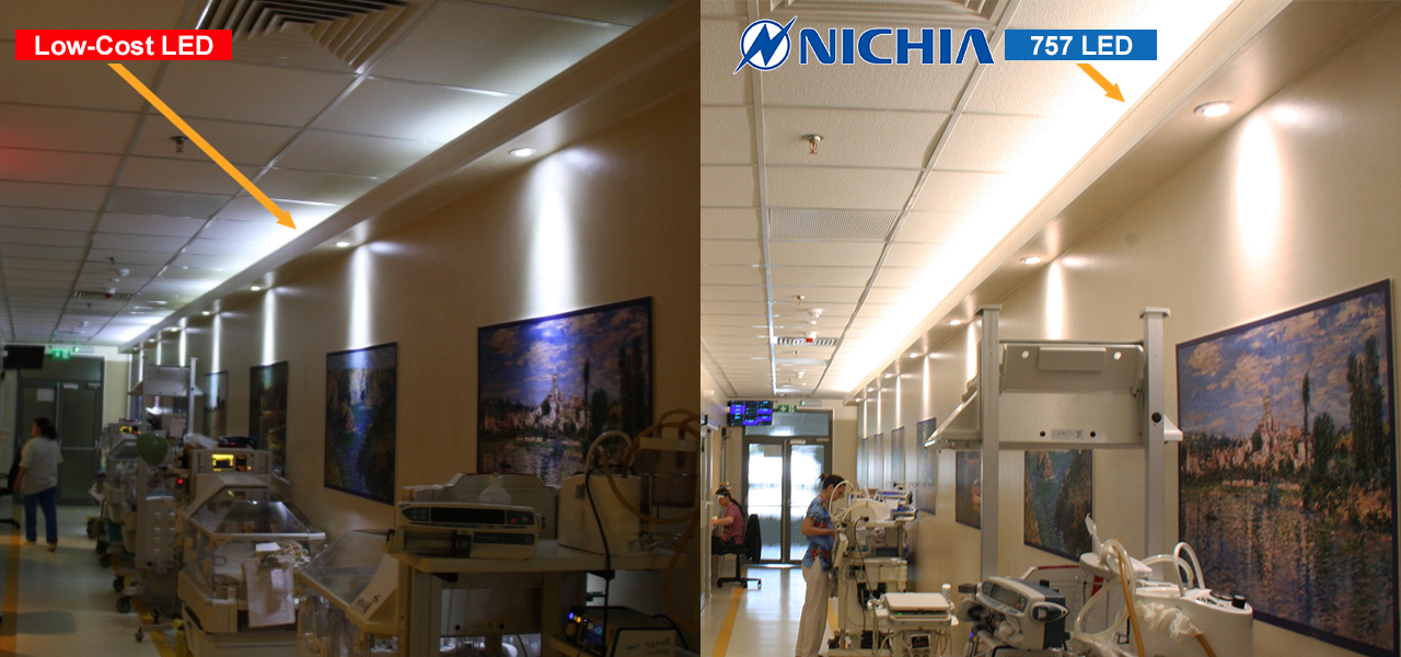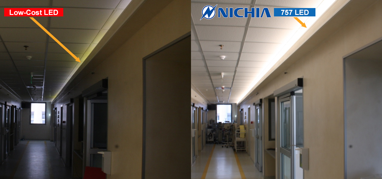 The difference of more than 65% in luminous efficacy is outstanding when seen in practice. After a cove light retrofit from low-cost LED strips to Nichia LED strips, the illumination increased by three to five times for the same power consumption: